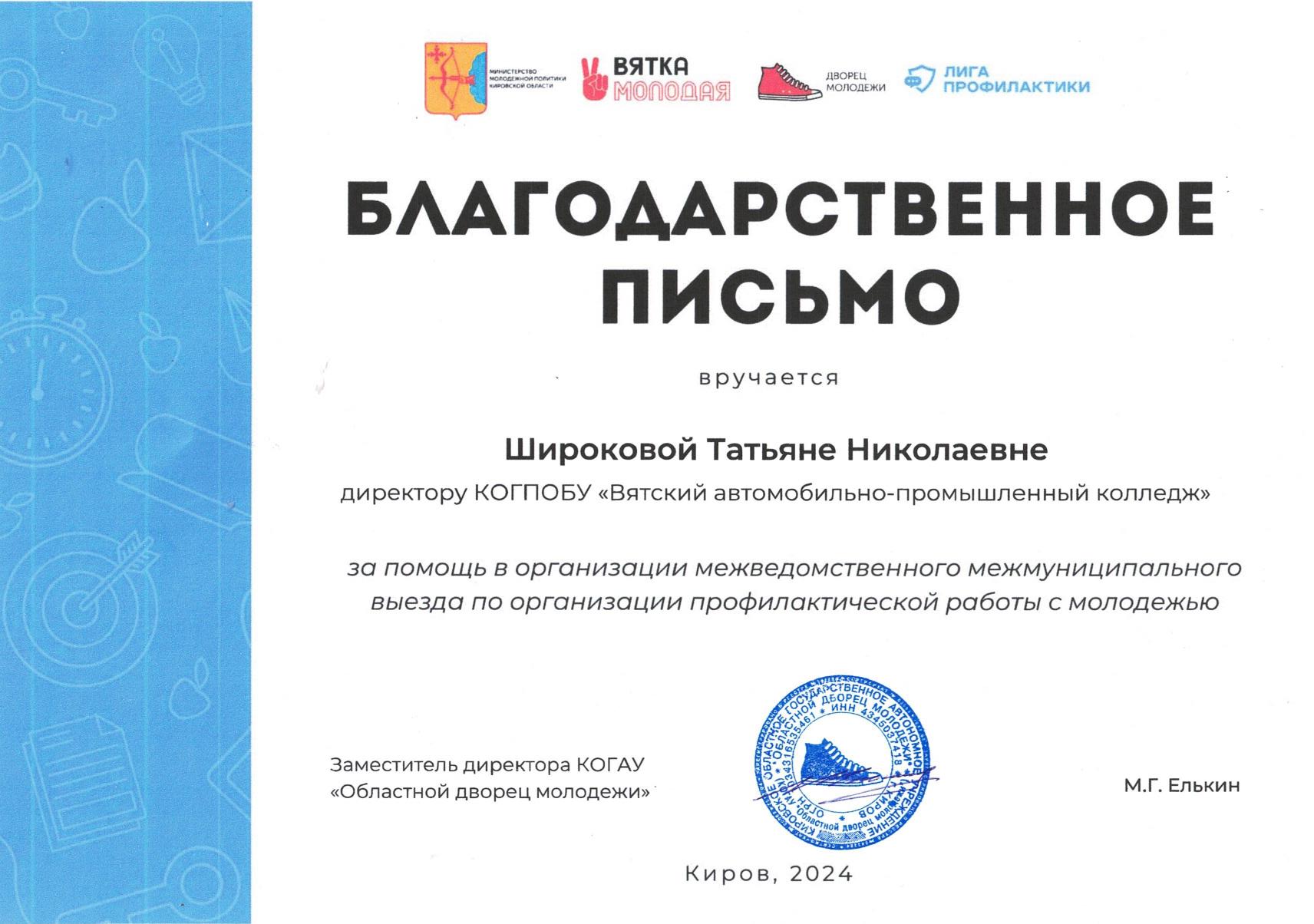 - Благодарственное письмо КОГАУ "Областной дворец молодёжи" за помощь в организации межведомственного межмуниципального выезда по организации профилактической работы с молодёжью (2024);