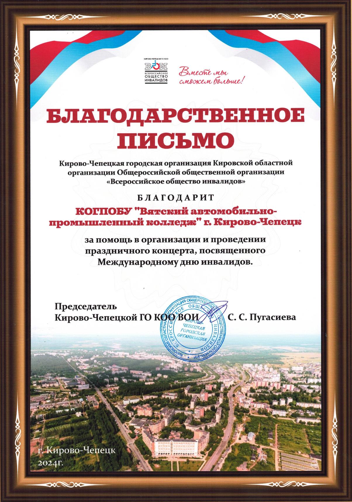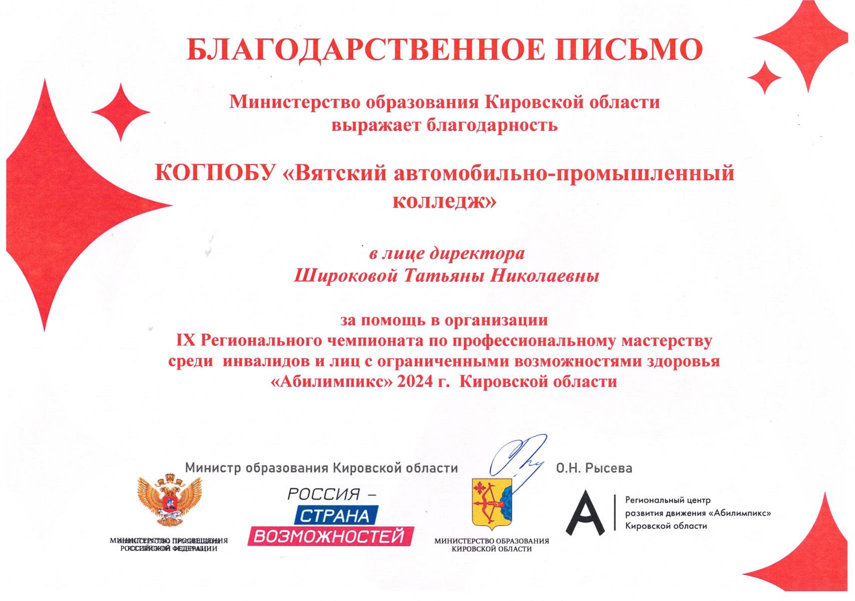 - Благодарственное письмо министерства образования Кировской области за помощь в организации IX Регионального чемпионата по профессиональному мастерству среди инвалидов и лиц с ОВЗ "Абилимпикс" 2024г.Кировской области;