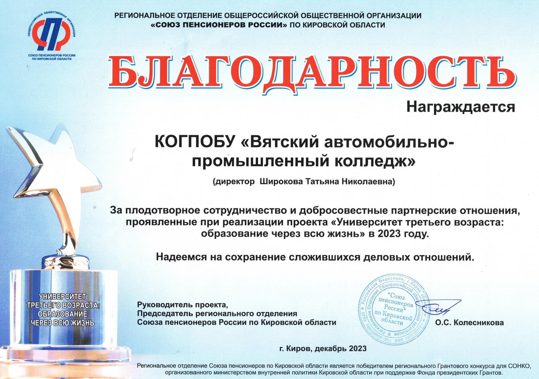 - Благодарность Регионального отделения Общероссийской общественной организации "Союз пенсионеров России" по Кировской области за плодотворное сотрудничество и добросовестные партнёрские отношения, проявленные при реализации проекта "Университет третьего возраста: образование через всю жизнь" (2023);