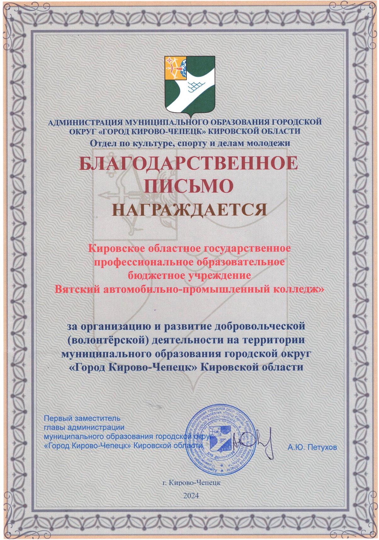 - Благодарственное письмо администрации муниципального образования городской округ "Город Кирово-Чепецк" Кировской области за организацию и развитие добровольческой (волонтёрской) деятельности на территории муниципального образования (2024);
