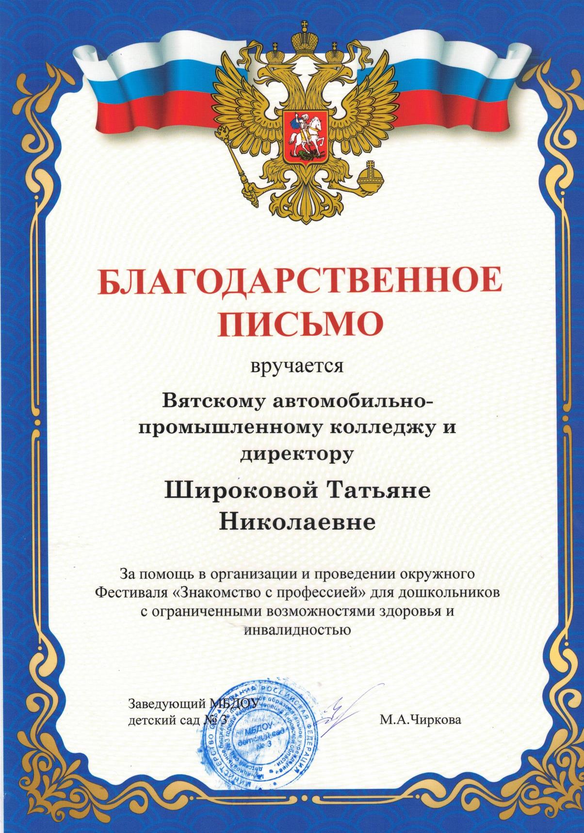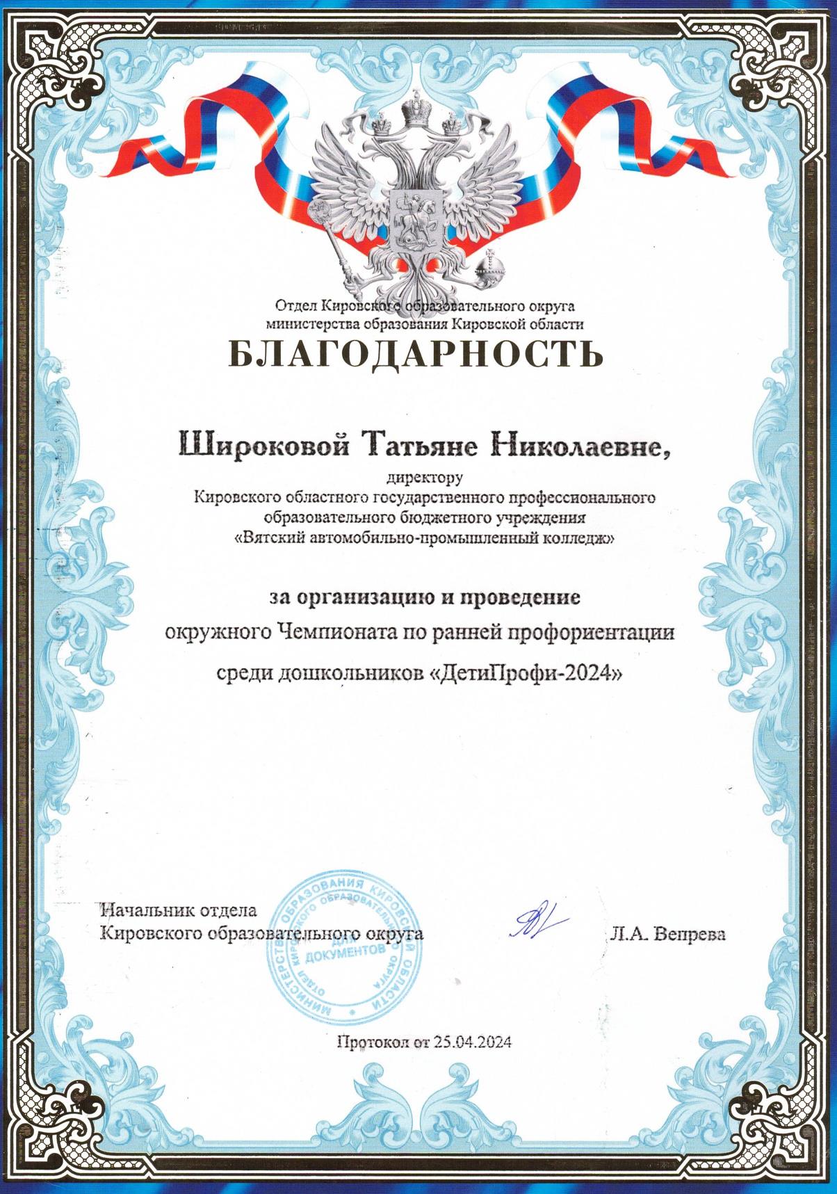 - Благодарность отдела Кировского образовательного округа министерства образования Кировской области за организацию и проведение окружного Чемпионата по ранней профориентации среди дошкольников "ДетиПрофи-2024";