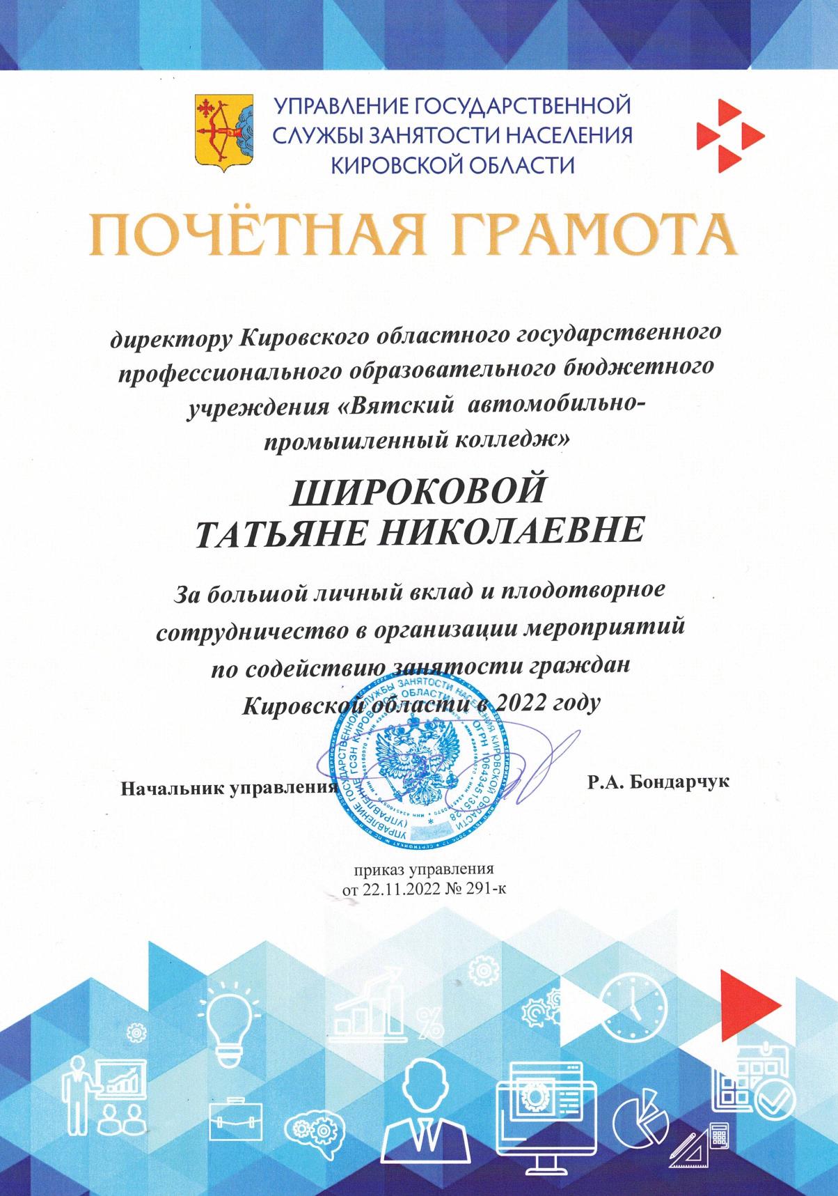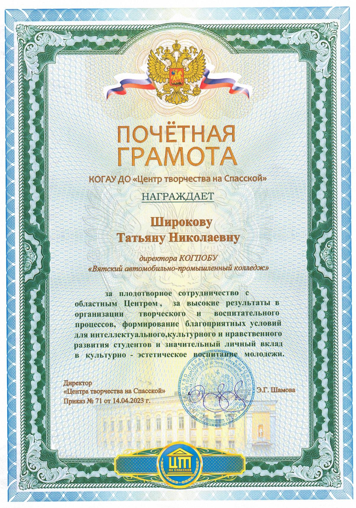 - Почетная грамота КОГАУ ДО «Центр творчества на Спасской» за плодотворное сотрудничество, за высокие результаты в организации творческого и воспитательного процессов, формирование благоприятных условий для интеллектуального, культурного и нравственноо развития студентов и значительный личный вклад в культурно-эстетическое воспитание молодёжи (2023);