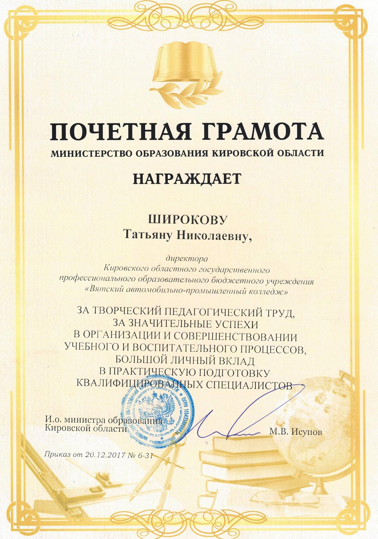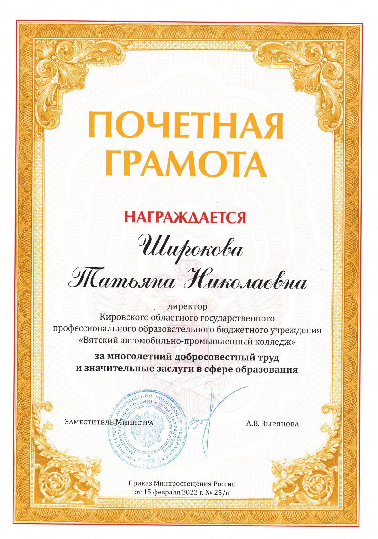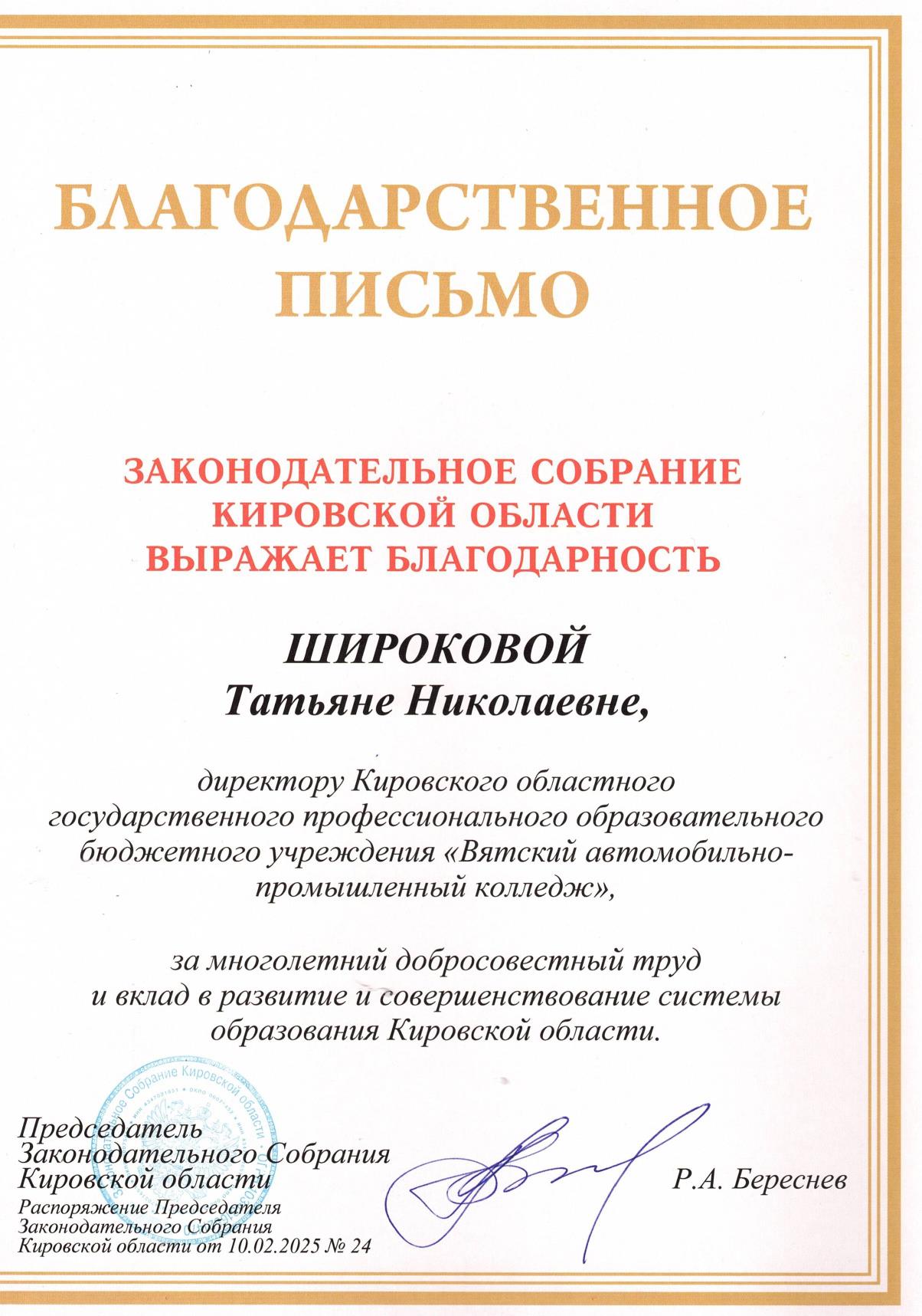 - Благодарственное письмо Законодательного Собрания Кировской области за многолетний добросовестный труд и вклад в развитие и совершенствование системы образования Кировской области (2025),
