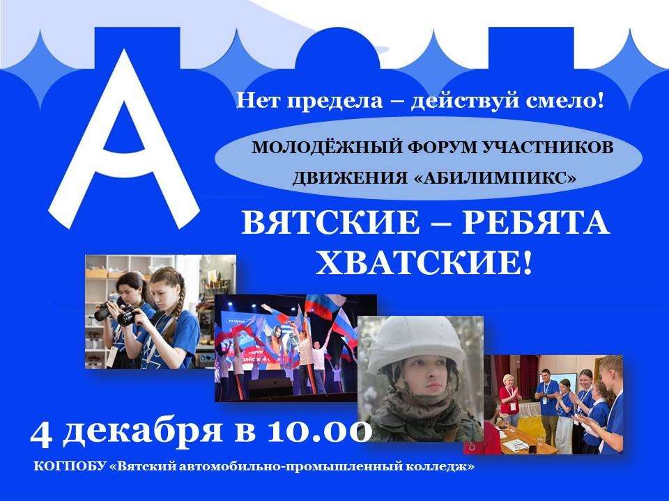 04 декабря 2025 года в Региональном центре развития движения «Абилимпикс» Кировской области КОГПОБУ «Вятский автомобильно-промышленный колледж» планируется проведение Молодежного форума для всех участников Регионального чемпионата «Абилимпикс» 2025 года под тематическим названием «Вятские – ребята хватские!».