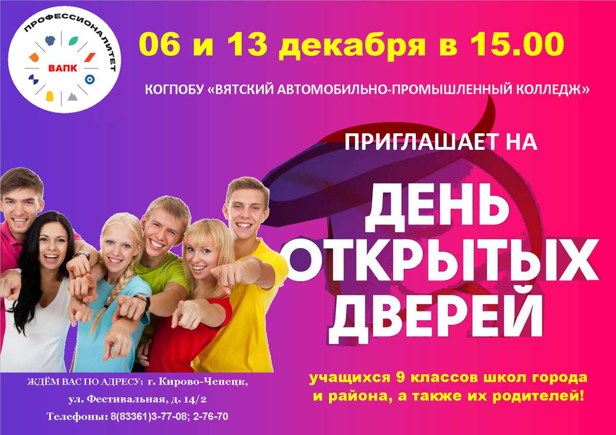 Приглашаем 6 и 13 декабря в 15:00ч. всех школьников города Кирово-Чепецка и района познакомиться с Вятским автомобильно-промышленным колледжем.