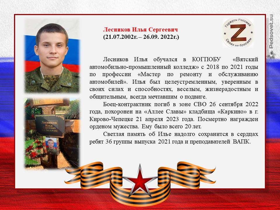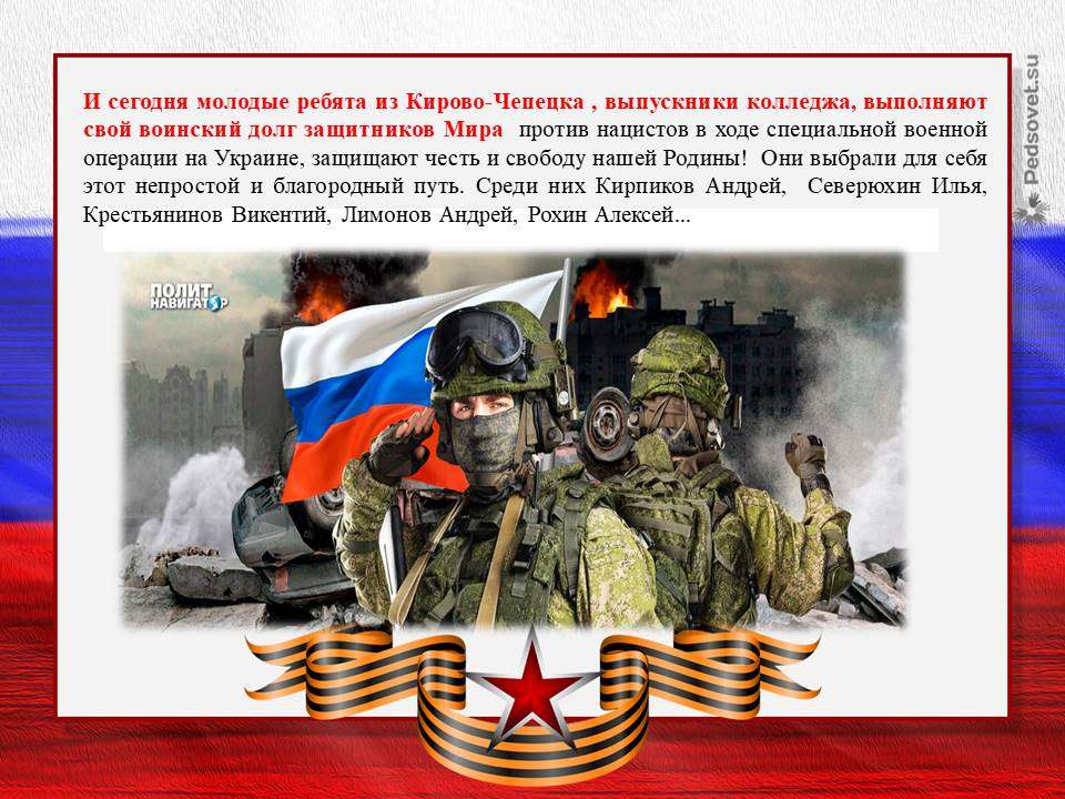 Вечная память павшим и слава всем, кто защищал и защищает суверенитет российского государства. "Горячие точки", СВО показали, что современные воины достойны героизма отцов и дедов, победивших фашизм в годы Великой Отечественной войны.